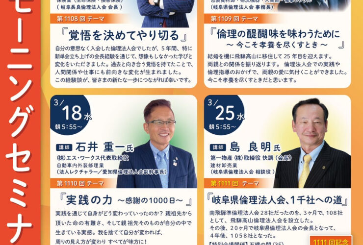 岐阜県倫理法人会は、12の単位法人会組織があり、それらをまとめて「岐阜県倫理法人会」としています。どの単会も会長・専任幹事を筆頭とした役員で構成され、週一回モーニングセミナーを開催しています。