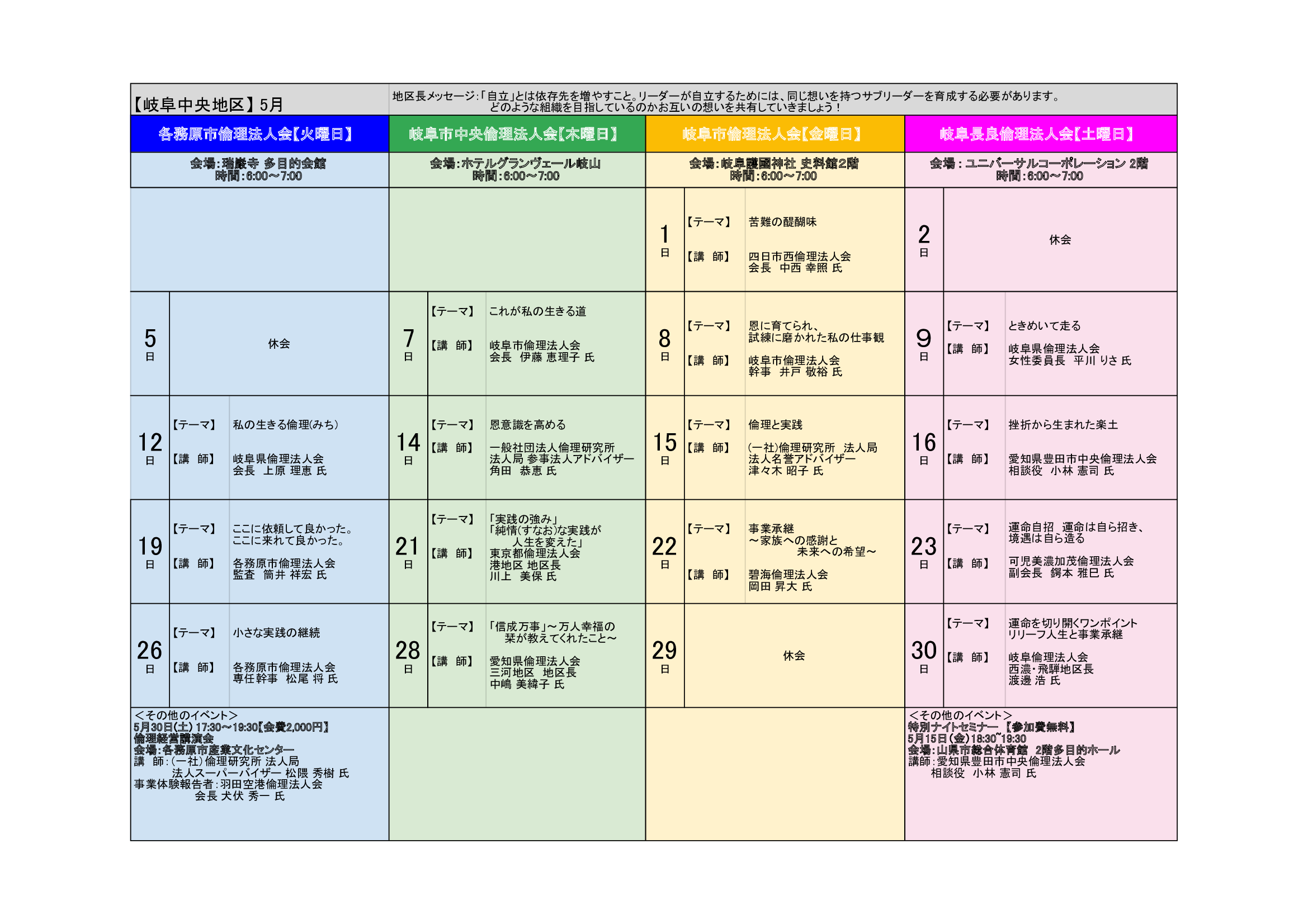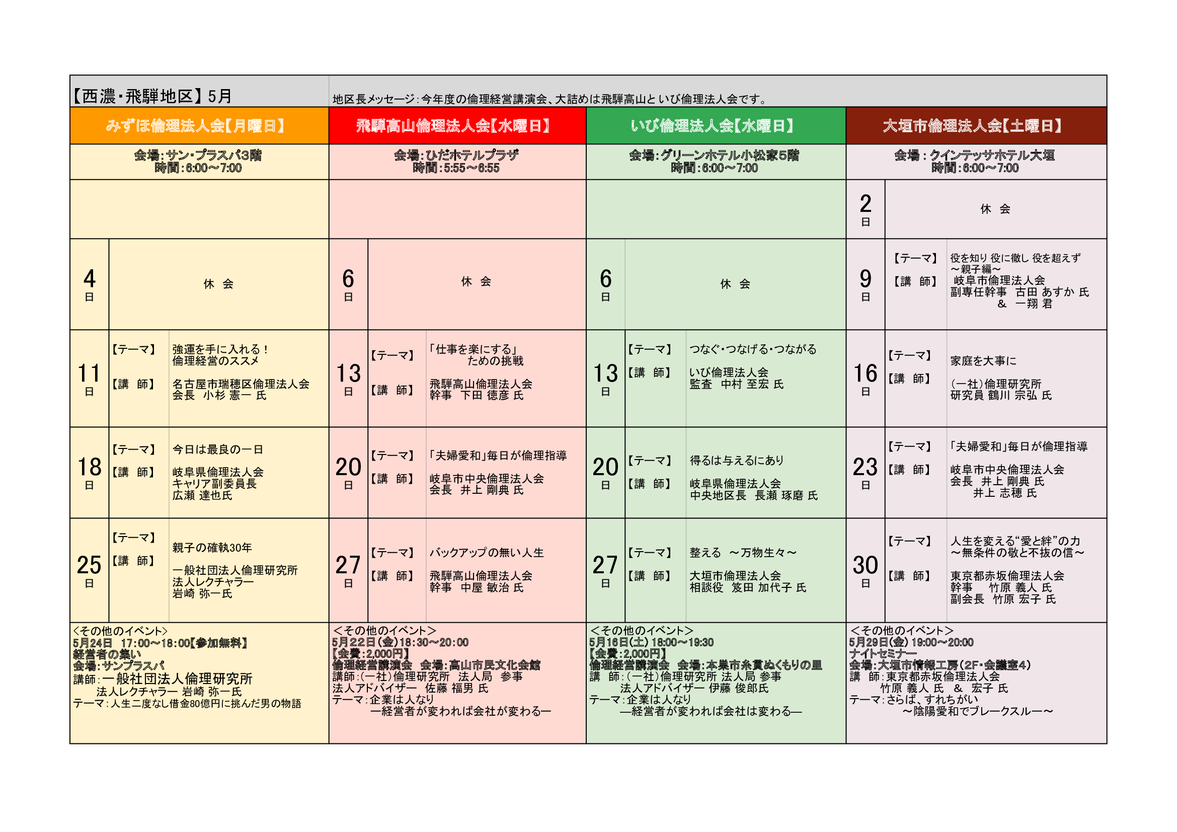各務原市倫理法人会【火曜日】 岐阜市中央倫理法人会【木曜日】 岐阜市倫理法人会【金曜日】 岐阜長良倫理法人会【土曜日】 |
