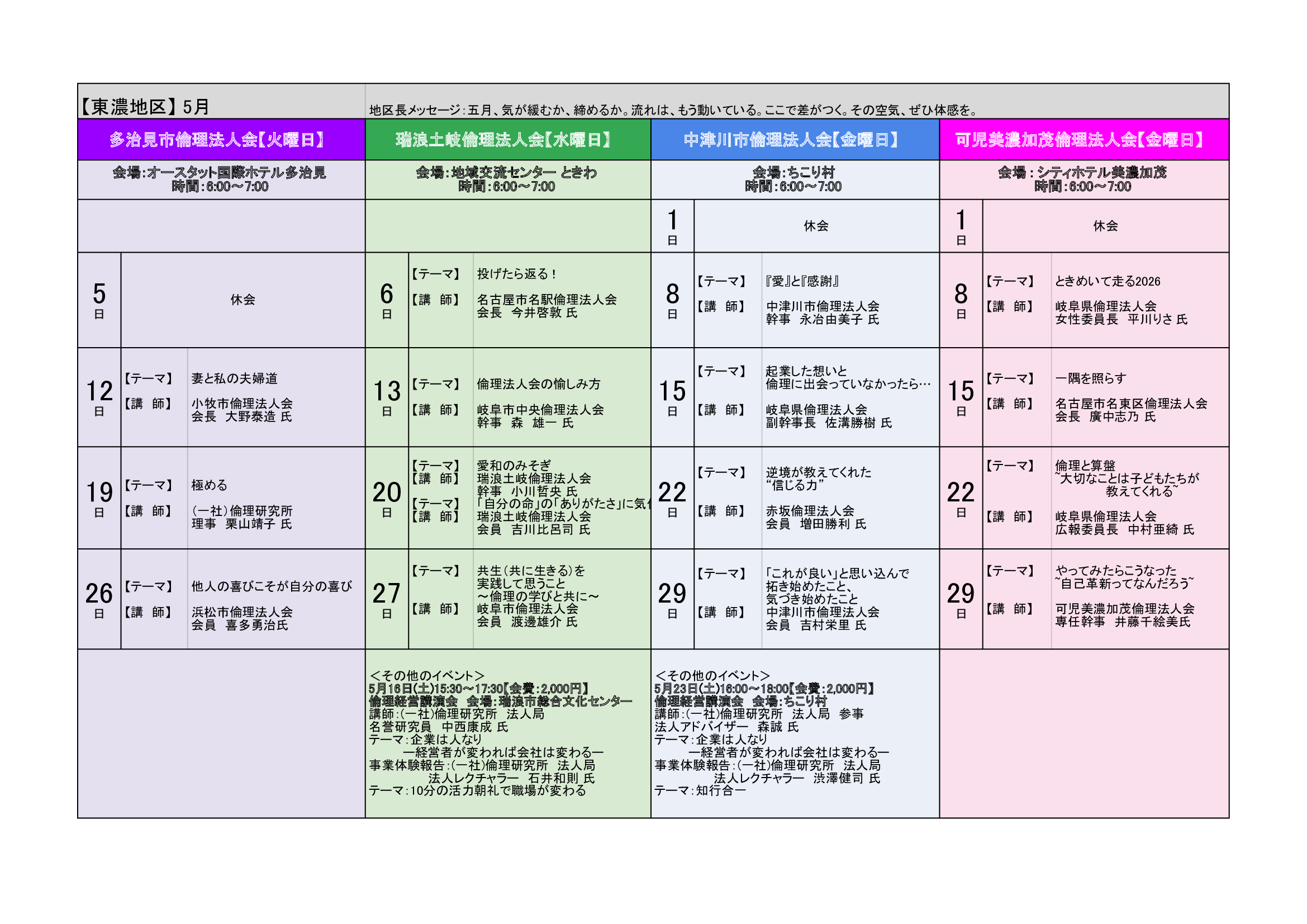 多治見市倫理法人会【火曜日】 瑞浪土岐倫理法人会【水曜日】 中津川市倫理法人会【金曜日】 可児美濃加茂倫理法人会【金曜日】 |