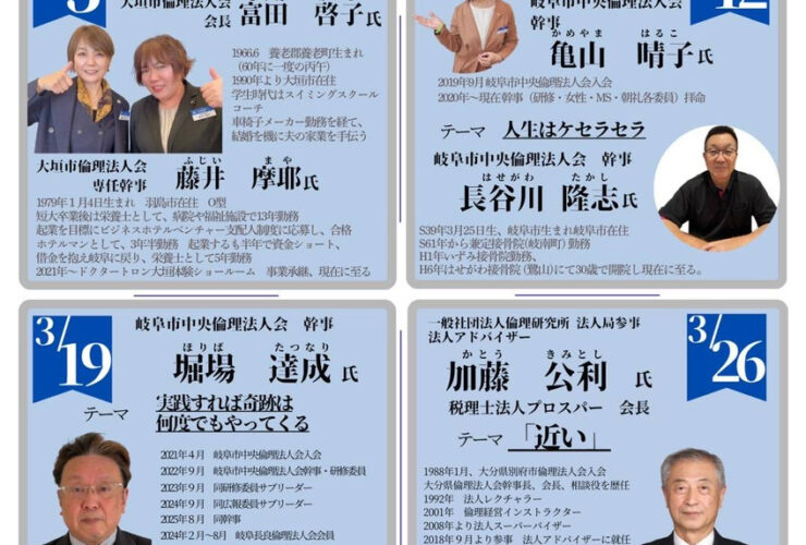 多治見市倫理法人会【火曜日】 瑞浪土岐倫理法人会【水曜日】 中津川市倫理法人会【金曜日】 可児美濃加茂倫理法人会【金曜日】 |
