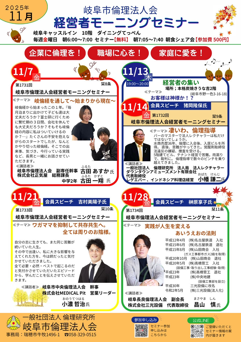 【告知】岐阜市倫理法人会 経営者モーニングセミナー11月予定表