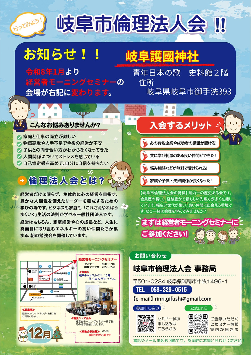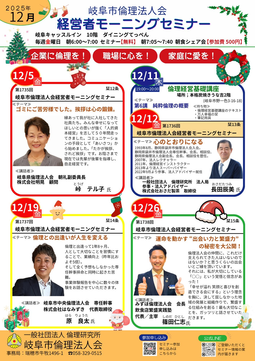 【告知】岐阜市倫理法人会 経営者モーニングセミナー12月予定表