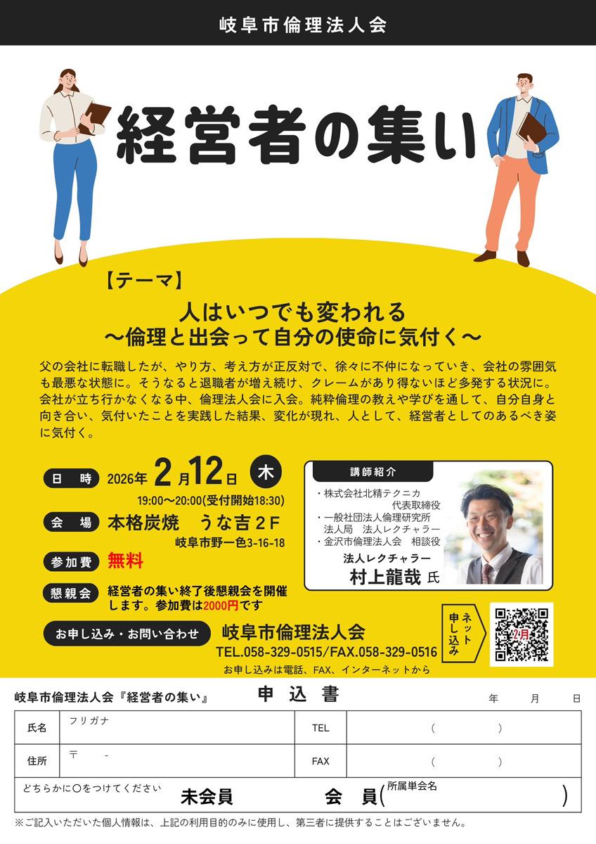 【告知】岐阜市倫理法人会 経営者モーニングセミナー2月予定表
