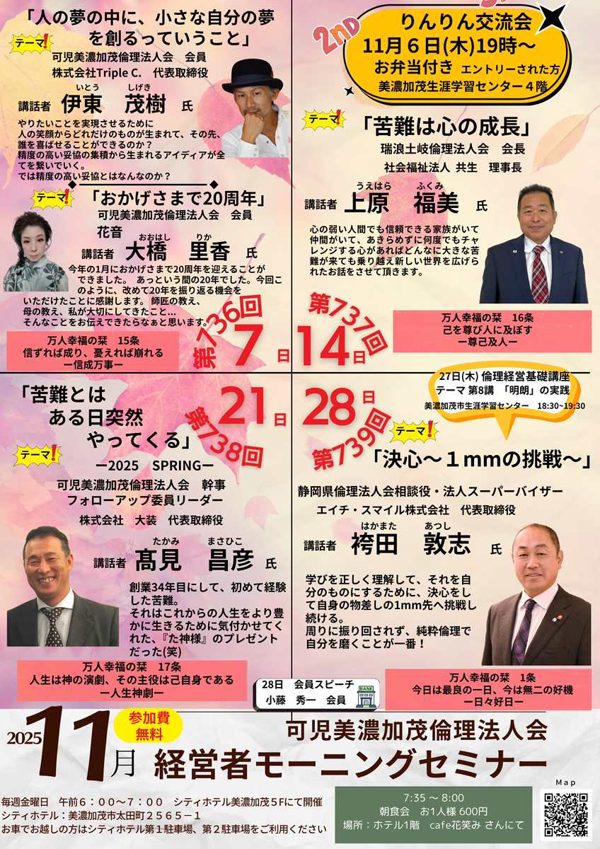 【告知】可児美濃加茂倫理法人会 経営者モーニングセミナー11月予定表