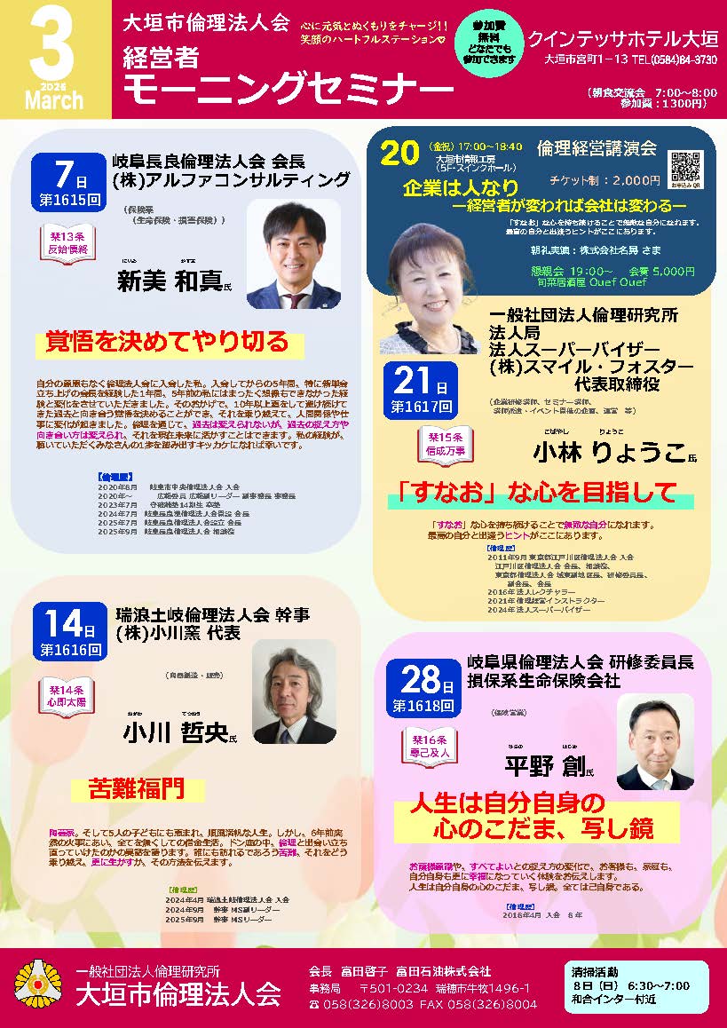 【告知】大垣市倫理法人会 経営者モーニングセミナー3月予定表