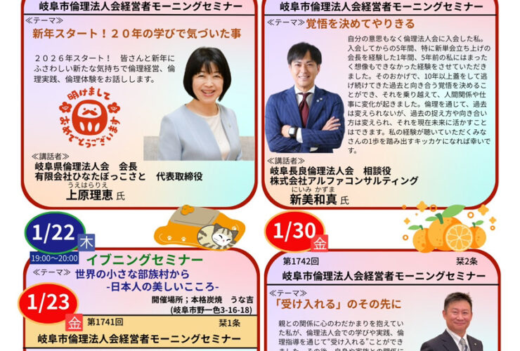 岐阜県倫理法人会は健全な経営での企業繁栄を実現するため経営者の在り方を学び、経営者同士が交流する会です