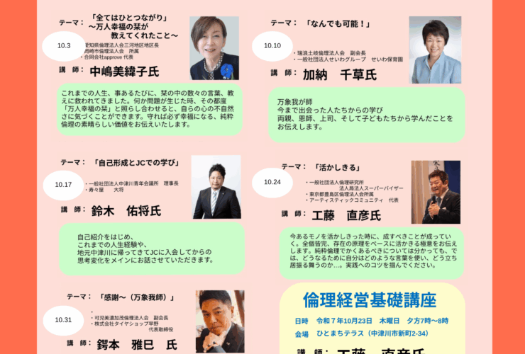 中津川市倫理法人会 会長挨拶 中津川市倫理法人会9代目を拝命いたしました小川鉄也です。当単会は岐阜県内で5番目に誕生し、今年で18年目を迎えます。 ほがらかに なかよく よろこんではたらく すなお どの言葉も、知らない人はいないでしょう。しかしこれを実行し続けることはとても難しいことです。 私は、「会社を経営したい」という気持ちから土木建設の世界に入り、希望通り自分の会社を持つことができました。ところが、すぐに自分の至らなさを知ることとなります。会社を経営するということは、経営者が成長し続けることであると身をもって体験し、倫理法人会の門をたたきました。当時の私に何が足らなかったのか…それは上記の4つの「心」でした。 倫理法人会は経営者が自己革新を図り、心の経営を目指す人々のネットワークです。会員相互が共に学び。さらに成長発展することができる会を目指しております。 「人は心が原動力」 今日も澄みきった張りきった心を持ち続けるために、共に学んでいきましょう。 毎週金曜日 ちこり村にてお待ちしています。 セミナー・イベント情報 ” 10月032025【告知】中津川市倫理法人会 経営者モーニングセミナー10月予定表 中津川市倫理法人会 モーニングセミナー情報 聴いた日からすぐに実践したくなる 経営者様向けモーニングセミナーを開催しています 週一回早朝6時から7時までの1時間、県内の各法人会で朝活モーニングセミナー開催中。 無料聴講開催中。開催日にお近くの法人会までお気軽におこしください。 開催曜日 毎週金曜日 早朝6時〜7時 開催場所 ちこり村 ※駐車場あり 〒509-9131岐阜県中津川市千旦林1番地の15 TEL : 0573-62-1545 備考 モーニングセミナー終了後、朝食交流会があります(参加自由)。 事務局所在地 【東濃地区事務局】 〒509-5203 岐阜県土岐市下石陶史台1丁目2267-7 電話:080-2625-6913 E-mail:rinri.tonochiku@gmail.com LINE公式アカウント 中津川市倫理法人会 セミナー会場アクセス ちこり村 〒509-9131岐阜県中津川市千旦林1番地の15 TEL:0573-62-1545 中津川市倫理法人会 役員一覧 会長 篠田 仁志 飲食店繁盛実践塾 副会長 岡田 明弘 (株)ベルフェ 専任幹事 髙嶋 由希野 salonあぷりこっと 副専任幹事 木下 詩乃 toiro tea STAND. 事務長 日比野 淳治 グローバルアイディアル(株) 副事務長 中村 智佳 Moderno 監査 村井 寛人 特定非営利活動法人 岐阜福祉事業支援友の会 監査 藤垣 寿道 藤垣会計事務所> 幹事 島田 早苗 といろルーム 幹事 林 清夏 幹事 林 知治 包装品のムラカミ 幹事 浅野 大輔 岐阜福祉事業支援友の会 幹事 馬渕 浩史 馬渕ひろし事務所 幹事 松原 由香 えにしリガール 幹事 鎌倉 美里 (株)INVEL 幹事 西田 真由香 (株)エマニエル 幹事 山口 真由美 ニッセイ保険エージェンシー(株) 幹事 安田 久弥 (有)深山 幹事 山田 啓介 有限会社トリアージ 幹事 杉山 誠 あいわ整体