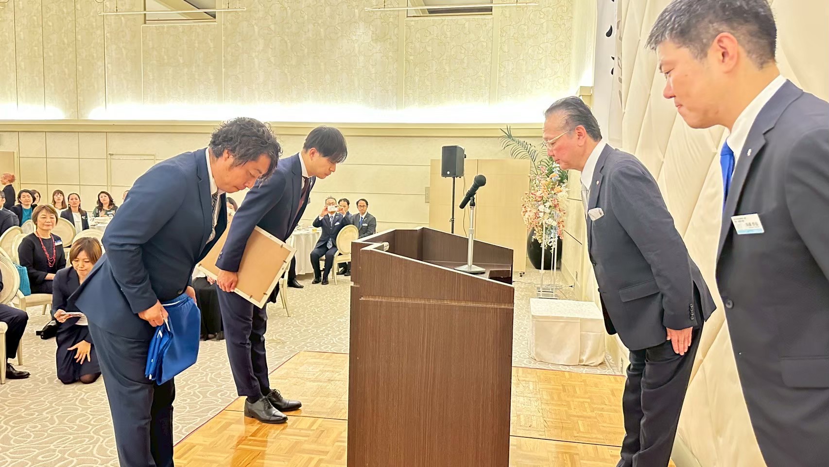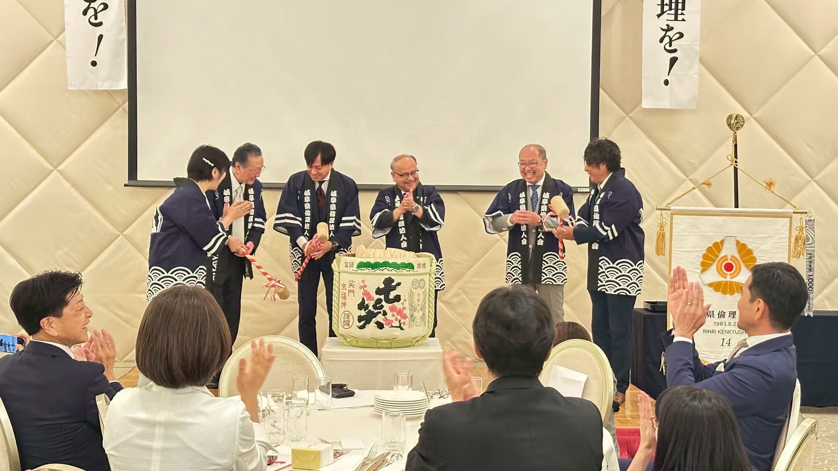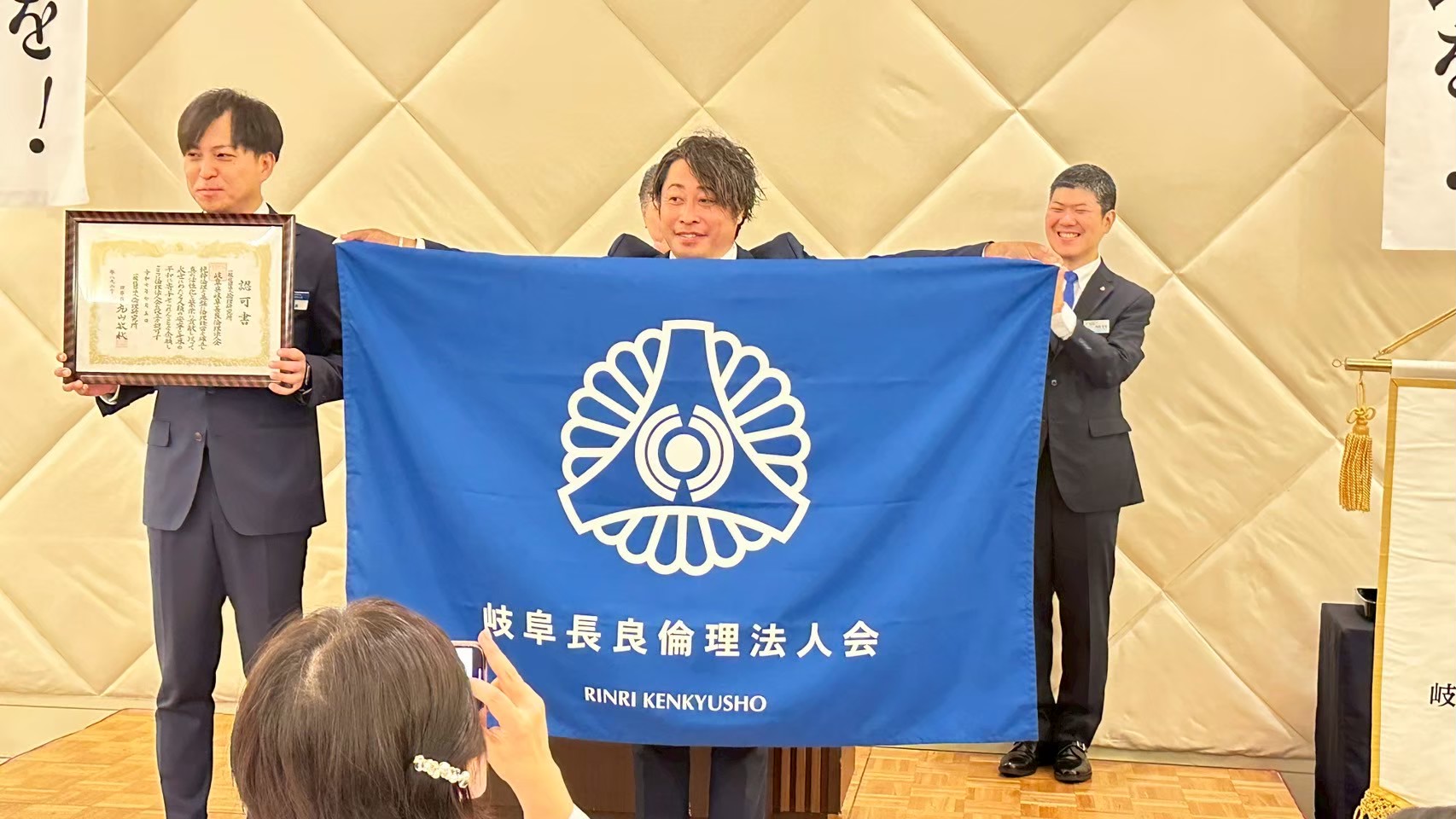 続いて倫理研究所法人局の和田毅局長より新美会長に設立認可証が、昌山専任幹事には倫理ブルーの行動旗が、そして単会を運営していく新役員に辞令が授与され、会場は一気に祝賀ムードに。